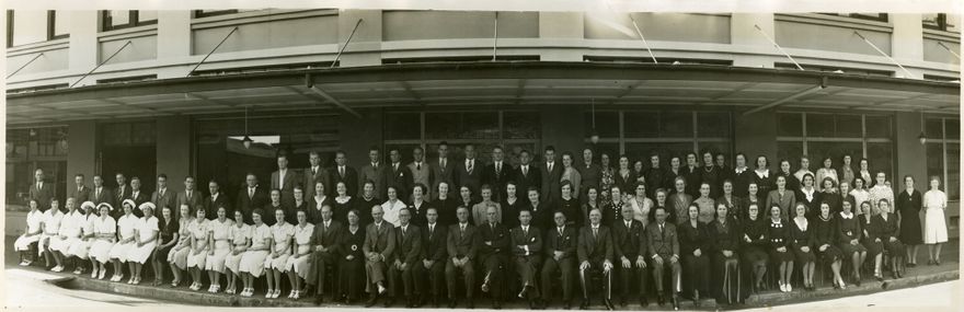 This photograph shows the staff at Collinson and Cunninghame Ltd in 1939. Back row: Messrs F Hardman, R Wlley, S Warson, R Scales, A Ronberg, L Durrant, B Court, K Tarr, H Radford, P Cowlishaw, R Meekin, Misses G Gray, F Nightinhale, Mrs M Gray, Misses Halley, P Doy, J Veysey, K Voss, U Whelan, R Peters, E Andrews, J Harvey, F McLaggan, O Stidolph, D Hardman, R Francis, D Drake, M Hooker. Centre Row: Messrs W Petrie, A Croad, J Mitchell, C Hurley, JP Cowlishaw, B Tipling, H Carpenter, N Hatwell, G Dixon, Misses N Tricklebank, N Coulter, G Piper, P Devine, J Price, B Gordon, K Scales, B Tarr, P Check, J Eaddy, P Tregurtha, E Irvine, M Dobson, B Moore, Simmonds, J Gubb, B Kelly, L Dalziell, B Stevens, L Torstonson, D Lett, Joan Klee, M Young, J Chapman, E Ussher, V Healy, M Gulliver, L Bambery, M Baillie, P Worsnop. Front Row: Miss T Brewer, Mrs N Muir, Miss M Whitmore, Mrs Bary, Miss A Ramage, Mrs A McCullouch, Mrs E Farmer, Mrs M C Coates, Misses H Kingbeer, J Leslie, E Blackman, U Stout, Mrs E Reeves, Miss E Duncalf and N Brewer, Mr K L Collinson, Miss C M Matthewson, Messrs L H Collinson, H L Cunninghame, E F Collinson, R Donald, A Rowe, V Cunninghame, A Vraighead, F Wevell, J Ferguson, C Dixon, Misses J Ritchie, D Floyd, M Pearse, M Cronin, T Lockwood, I Ensom, M Christensen, G Underwood, G O'Connell.