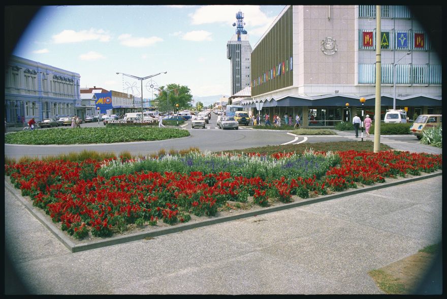 Flower garden on the Square, on the corner of Main Street. Beyond can be seen the Chief Post Office on the left and the Telecom tower and the Public Library on the right.
