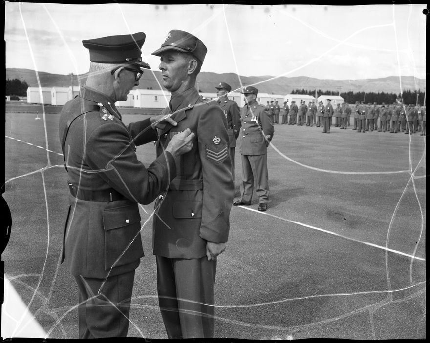 This image was taken for a story that ran in The Manawatu Evening Standard on 11 April 1961 "Brigadier G.P. Cade, D.S.O., presenting long-service and good-conduct medals to W.O. II F.F. Dorrington, W.O. II H.A. Edwards and Staff-Sergeant G. Reid. They have completed 15 years of service."