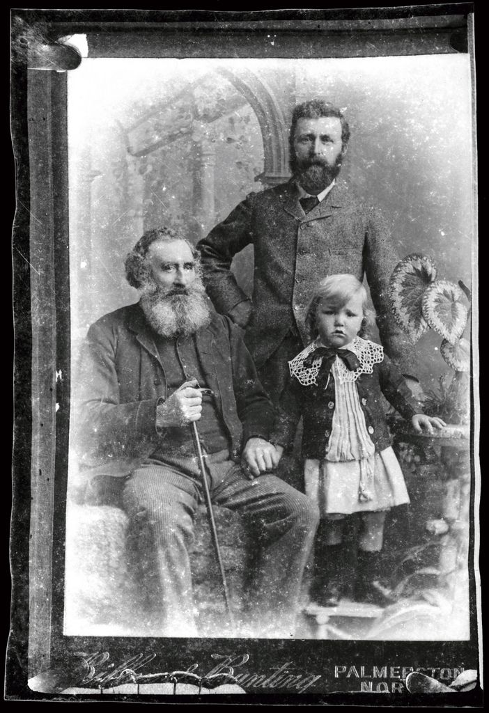 Abraham Honore, on the left, conducted the first religious service in the Danish language in Palmerston North, in a hut in Coleman Place 25 February 1872. From Denmark, he arrived in New Zealand in 1848 as a missionary under the direction of the North German Missionary Society. His son, also Abraham, standing, was born on Stewart Island and came to the Rangitikei when he was 12 years old. In 1881 he settled to farm at Merry Creek, in the Fitzherbert area(over the river from Palmerston North). Abraham Junior married a Miss Greenwood and had four sons.