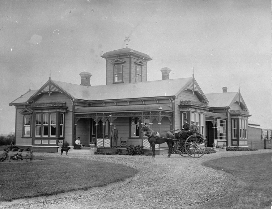 This country home was built by William Manson, son of Donald Manson, born in 1829 in Tervally. William was married to Elizabeth Gladdens on 7th of September 1865, at Gromlers Creek near Mansfield, Victoria and they had nine children. In the photograph, Mr William Manson is standing on the verandah; the girl on the verandah steps with her doll is Minnie Manson. In the gig is John Donald Manson,born 1866 eldest son of William. He inherited Cluny Park and had 2 children by Jeannie Paton. Myrtle Elizabeth was born at Cluny Park in 1900, Henry Paton was born in 1909 in Australia, where Henry James was Trade Commissioner for New Zealand till 1932, when he retired and bought a property near Raetihi called Mangaone. The third person in the gig is Arthur Barron born 1879, died 1922, he is around 15 yrs old in this photograph.