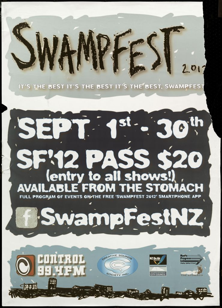 Swampfest 2012. It's the best it's the best it's the best, Swampfest. Sept 1-30th. SF'12 pass $20 (entry to all shows!) available from The Stomach. Full program of events on the free 'Swampfest 2012' Smartphone app. f SwampFestNZ. Part of a collection of posters that were displayed at The Stomach, Lombard Street, venue for Creative Sounds Society Incorporated.
