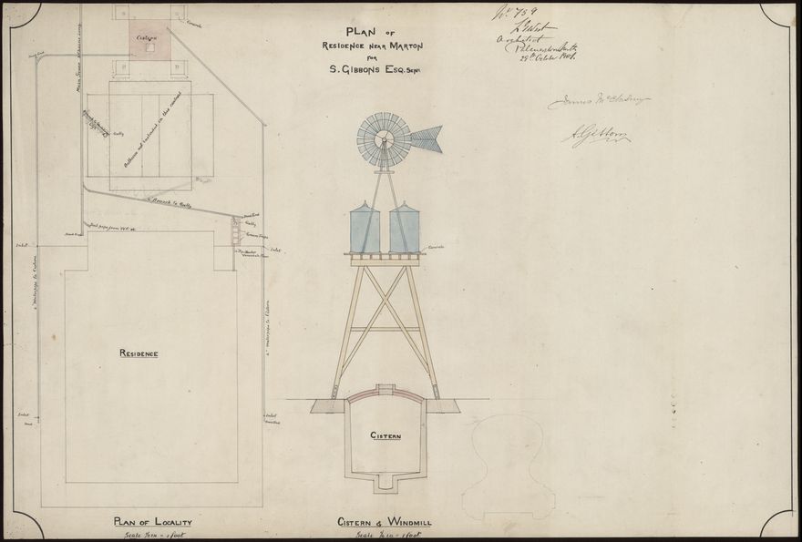 These plans for a two-storey, eight-bedroom house, cistern and windmill were designed by L. G. West for S. Gibbons. The Danish-born architect Ludolph Georg West (1846-1919) established an architectural practice in Palmerston North in about 1880. In 1912 he formed a partnership with is son, Ernest Vilhem West, who continued the business after his father's death.