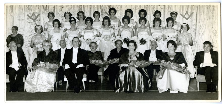 Official photograph of the debutantes and offical party at the Grand Masonic Ball, held at the Izadium, Fitzherbert Avenue, Palmerston North. Organised by the Palmerston North combined Masonic Lodges, 17 young women were formally introduced into society. From left. Back row: Margaret Burns; Michelle Robinson; Sharon Ford; Maren Fraser; Denise Jennings; Jennie Free; Adrienne Johnson; Ianthe Watford; Lila Stansfield. Middle row: Flower girl (either Christine Check or Kaye Wagstaff); Jonette Elder; Jocelyn Smith; Maralyn Burgess; Dianne Loveridge; Judith Brown; Verna Brown; Robin Pizzey; Francie Kirton; Flower girl. Seated (order unknown unless indicated): The Mayor, W Bro. G M Rennie (far left); Mayoress, Mrs Rennie; RW Bro. H G Blight and Mrs Blight; RW Bro. P Morris and Mrs Morris; RW Bro. T Donaldson and Mrs Donaldson; Bro. B O'Brien and Mrs O,Brien. Far left, standing is Mrs Elspeth McKenzie, Debutante's Mistress.