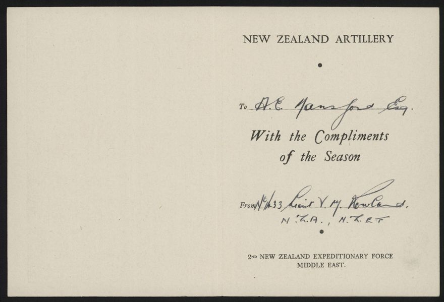 Christmas card from the New Zealand Artillery of the New Zealand Expeditionary Force, Middle East. The Inscription reads: "New Zealand Artillery. To A. E Mansford Esq. With compliments of the season. From No.1/433 Lieutenant V M Rowland, N.Z.A, N.Z.E.F, 2nd New Zealand Expeditionary Force, Middle East.