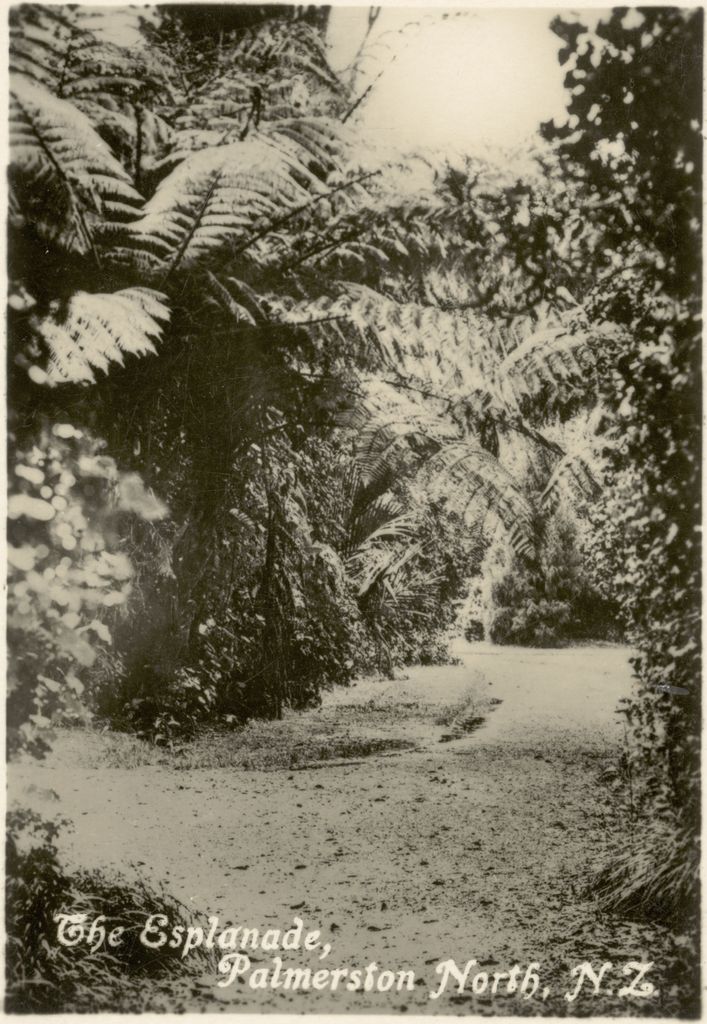 This image is from a series of souvenir cards that show various locations around Palmerston North. This card shows a path through the Victoria Esplanade Gardens