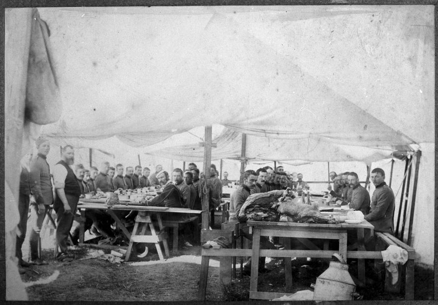 Members of the Manawatu Mounted Rifles in the mess tent, during an encampment.