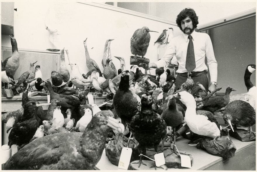 These 112 stuffed birds were the main evidence in the biggest prosecution ever brought by the Wildlife Division of the Internal Affairs Department, in Palmerston North on April 4, 1977. Ninety nine of the birds collected and stuffed were absolutely protected and two were partially protected. Eleven were game birds. For more information, see Manawatū Evening Standard, 5 April 1977, p.1.