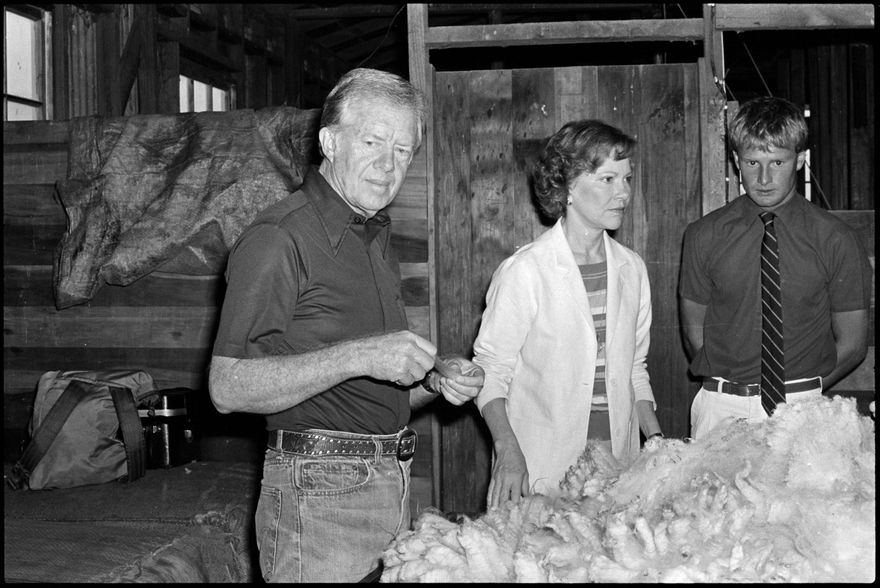 This image was taken by the Evening Standard on the 11th of February 1984 but was not published. It depicts former United States president Jimmy Carter and his wife Rosalynn visiting the hobby-farm of Richard and Barbara Walton at Aokautere. Also featured is chief Wool Board shearing instructor Robin Kidd.