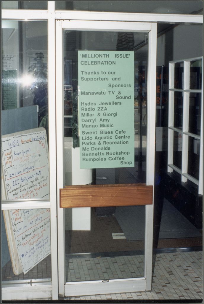There was a celebration of the millionth issue of a library item, at the Palmerston North Public Library. This notice on the door recognises the local sponsors of prizes.