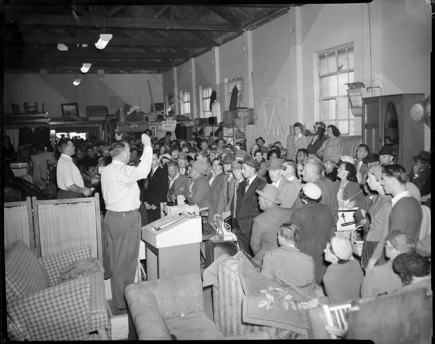This image was taken for a story that ran in The Manawatu Evening Standard on 5 March, 1959. "Another article is sold at the fall of the hammer. Bidding was keen for the widely diversified articles which were put up for sale by the Police Department today. The sale was conducted before a very large crowd."