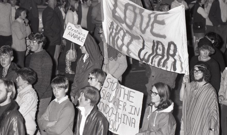 The March was organised by the Palmerston North Anti-war Mobilisation Committee, including R. Lyall, Massey University Student Association President Gary Emms, and Unionist Alan Millar. The Nash Street Jug Band lead the singing and Hana Burke sang ‘a Maori song of parting’. Poetry was read by Mr. Lyall and Des Woods. The Reverend Loyal Gibson of the Trinity Methodist Church lead prayers after Churches across the city rang their bells in solidarity.