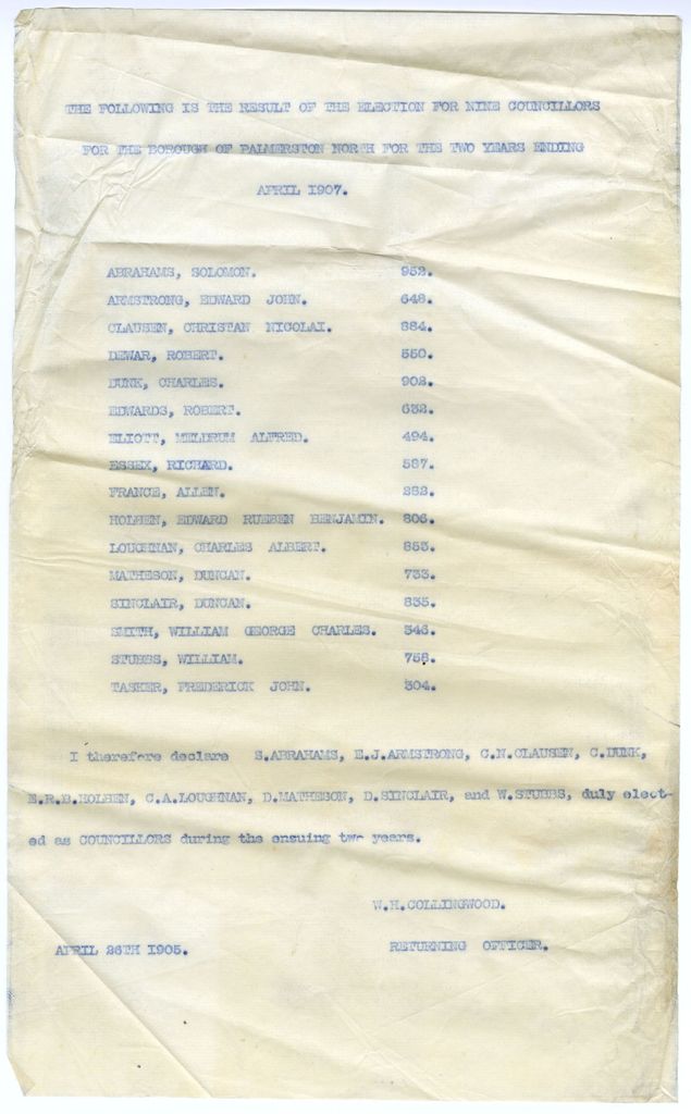 Voting paper, with full results handwritten in, for the 1905 election of Councillors in Palmerston North, signed by M H Collingwood, Returning Officer. Also the official declaration of the results (carbon copy). Standing for the election were Solomon Abrahams, Edward Armstrong, Christian Clausen, Robert Dewar, Charles Dunk, Robert Edwards, Meldrum Eliott, Richard Essex, Allen France, Edward Holben, Charles Loughnan, Duncan Matheson, Duncan Sinclair, William Smith, William Stubbs and Frederick Tasker