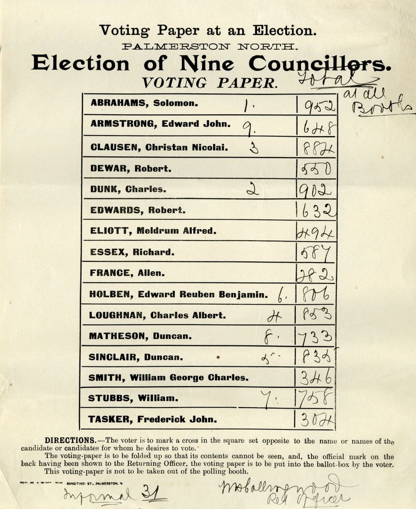Voting paper, with full results handwritten in, for the 1905 election of Councillors in Palmerston North, signed by M H Collingwood, Returning Officer. Also the official declaration of the results (carbon copy). Standing for the election were Solomon Abrahams, Edward Armstrong, Christian Clausen, Robert Dewar, Charles Dunk, Robert Edwards, Meldrum Eliott, Richard Essex, Allen France, Edward Holben, Charles Loughnan, Duncan Matheson, Duncan Sinclair, William Smith, William Stubbs and Frederick Tasker