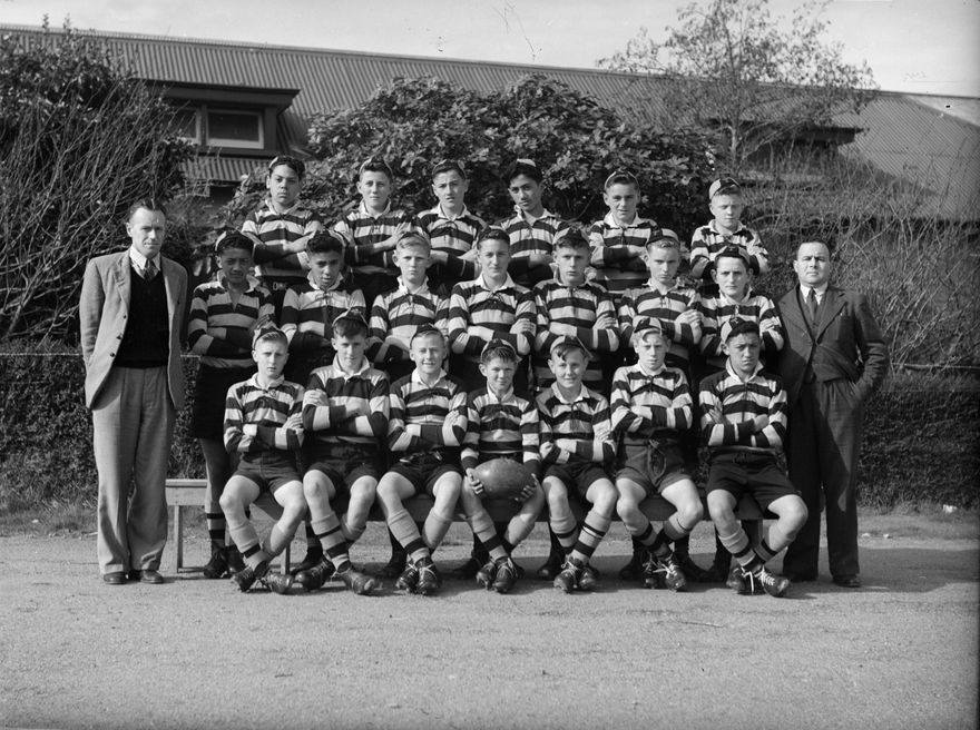 This photograph shows a team of young rugby players with two older gentlemen, perhaps coaches. The subjects and location are unidentified, but it is likely to be somewhere in Palmerston North.