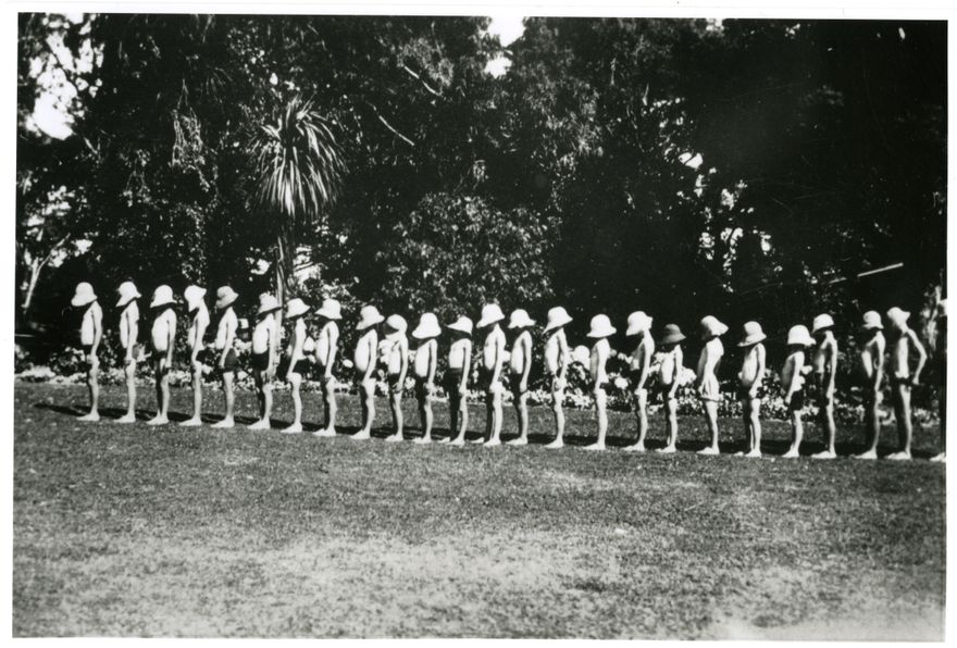 Malnourished children lined up at Awapuni Health Camp. The camp was held at Awapuni Racecourse 12 February - 13 March, 1930.