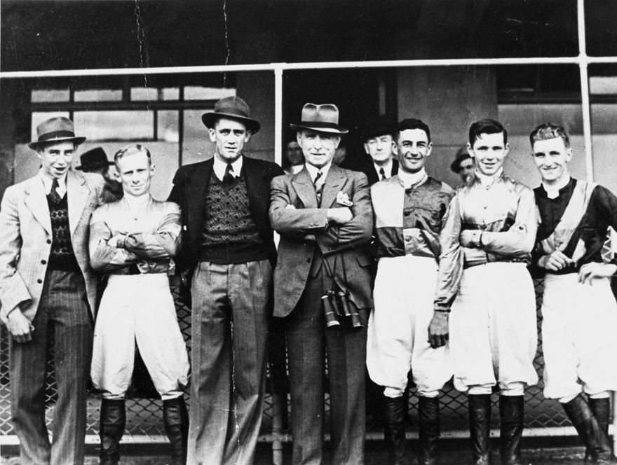 George Willmot New (1883-1963) began as a jockey at the age of 14 and then turned to training horses. By the 1930s he was the owner of stables on part of the original ‘Highden Estate’, on Totara Rd. adjacent to the Awapuni racecourse. He had many successes and retired in 1950. From left S. Waddell; George Tattersall; Unknown; George New; Unknown rear; Bill Broughton; Bubs Waddell; Clem Bowry (?).