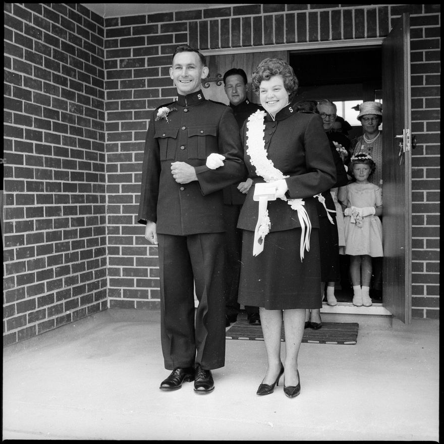 This image was not published in The Manawatu Evening Standard, taken on 4 January, 1964. [The bridegroom (Mr A. G. Davis), the bride, formerly Miss R. A. Jones, exit the Salvation Army Citadel in Terrace End.] See also: 2017N_2017-20_018273, 2017N_2017-20_018274