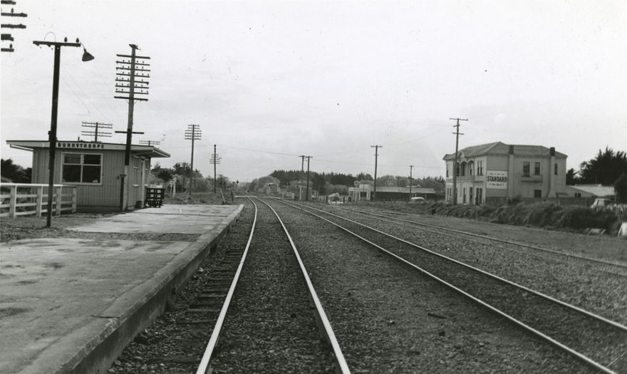 The township of Bunnythorpe lies within the original Manchester Block, purchased from the New Zealand Government by the Colonist's' Land and Loan Corporation Ltd in 1869. A Bunnythorpe railway station was first built in 1875. It was replaced by this smaller building in 1957, which was in turn removed in 1975. The Royal Hotel, originally the Bunnythorpe United Hotel, was built c1890s. A new single storey replacement hotel opened next door in 1973.