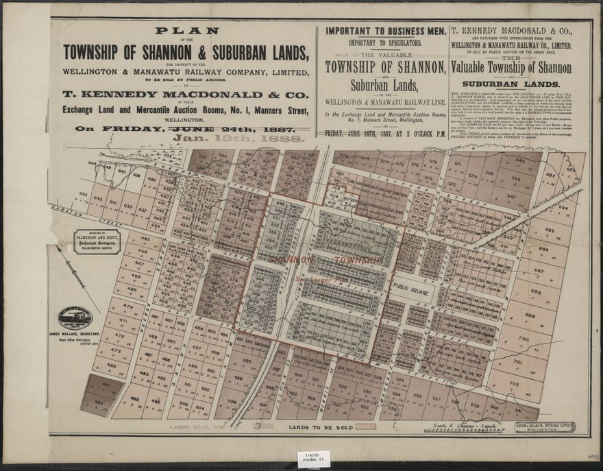 Land sale map of Shannon and the surrounding area, with land being offered for sale by the Wellington & Manawatu Railway Company.