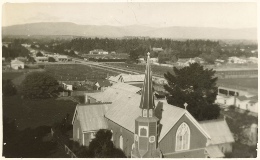 Looking across the roof of the second All Saints Church, 1882 - 1915, to the intersection of Linton and Fergusson Streets. The back of the original photograph says “Dr George Wilson’s near top of spire. F S. Goldingham’s against trees to left of Dr Wilson’s, stable of Manawatu Club right, Schlarger’s corner on the intersection of Linton and Ferguson Streets, Craig Lockhart on hill above the spire.”