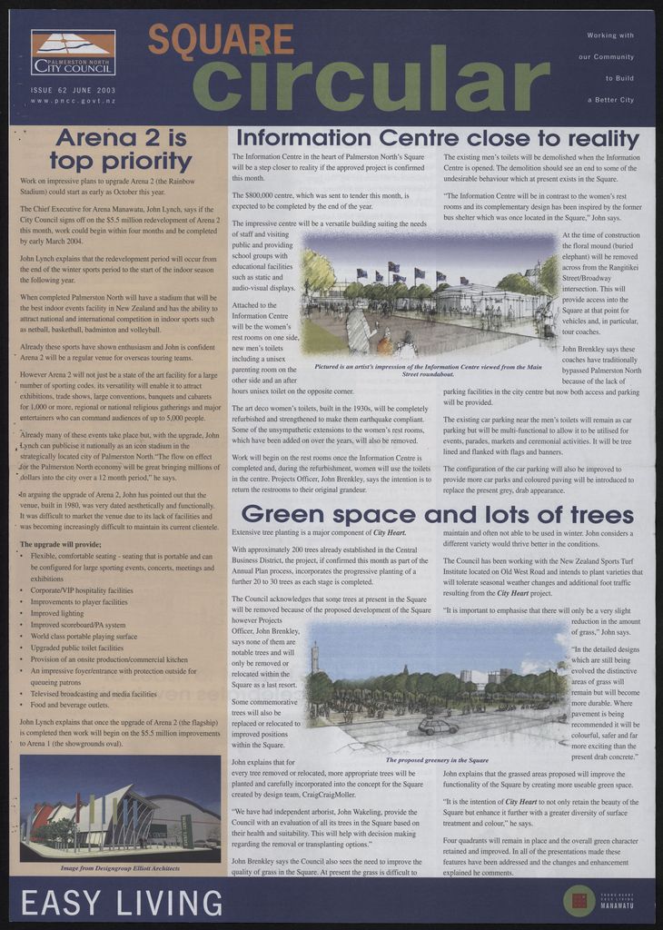 The Square Circular was Palmerston North City Council's monthly community publication, informing Palmerstonians of PNCC initiatives, activites, and events. This month's issue includes: Arena 2; information centre; City Heart; the Square; Rod Titcombe; ward committee; pest control; employment initiatves fund; performing arts trust funding; sister city; parking; Lido; Freyberg pool; central environmental laboratory; water supply; civil defence; Whakarongo school; Sledge track; library; Te Manawa; Rugby museum; Regent theatre; Anna Leese; signage; animal control; Telecom call centre.