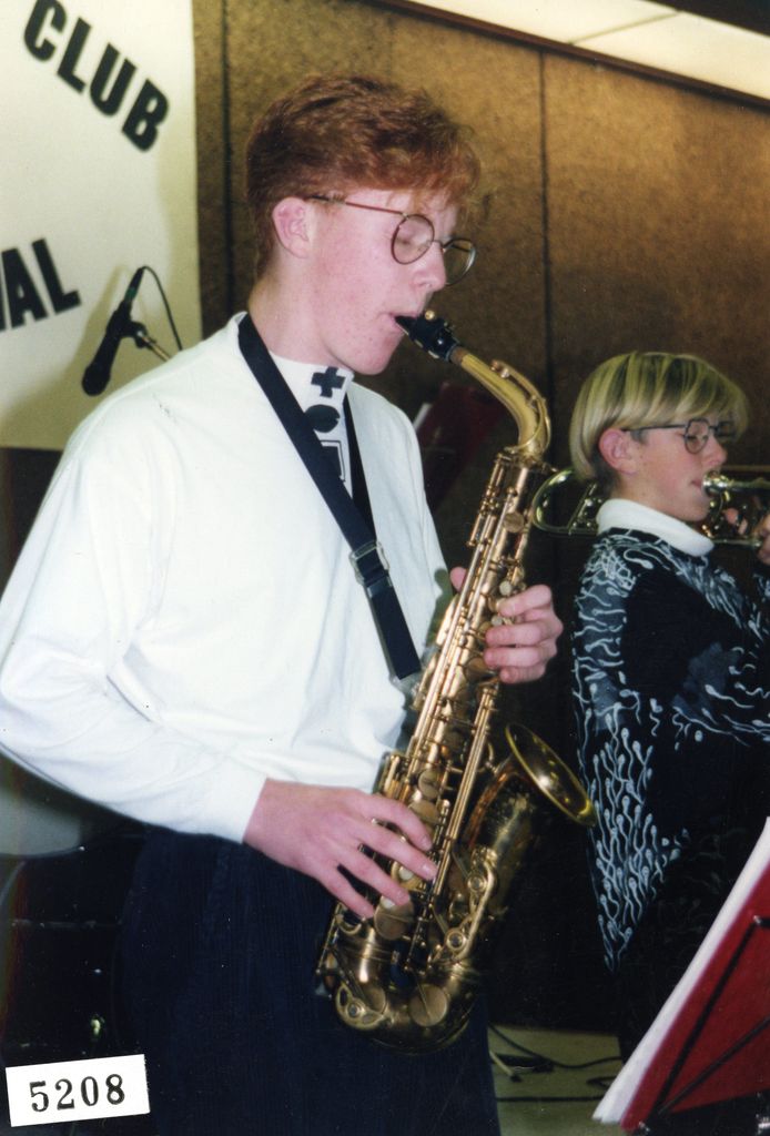 Hayden Chisholm (alto saxophone) and David Bremner (trombone) performing with the Black and White Jazz Band from New Plymouth Boys’ High School at the 25th Annual Manawatū Jazz Festival.
