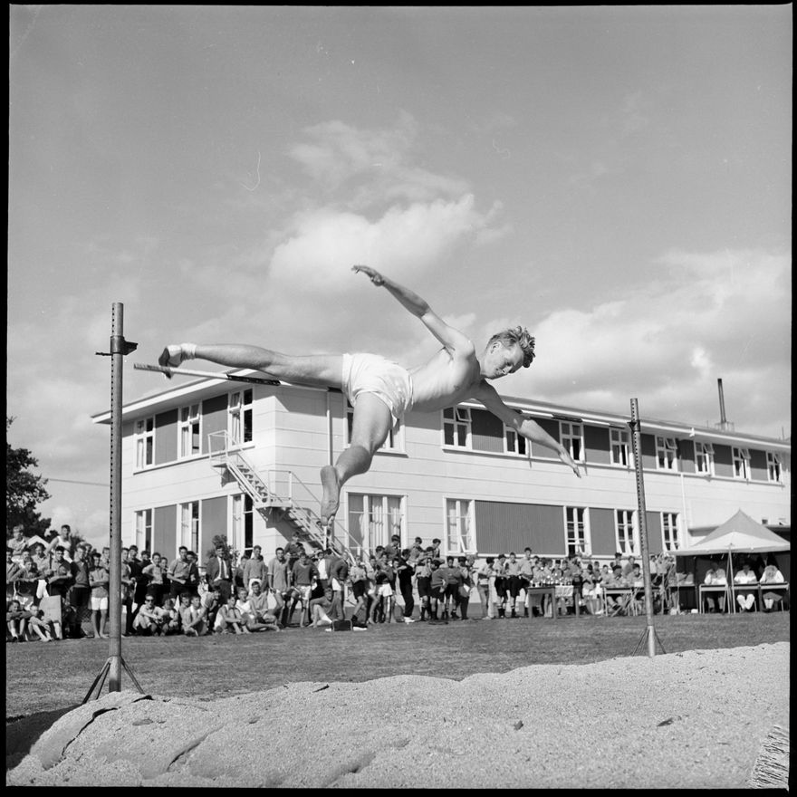 This image was taken for a story that ran in The Manawatu Evening Standard on 21st March, 1963. "H. Griffen, seen jumping 5ft 6in, gained first place in the Palmerston North Boys' High School athletic championships held at the school last week."