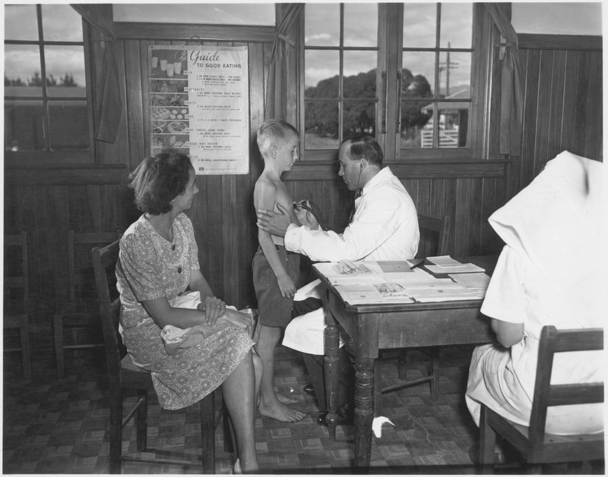 A photographic series prepared by the Prime Minister’s Department in 1947 to attract British migrants. The Evans family of 5 Mansford Place, Palmerston North were selected to show the living conditions of a typical New Zealand family. Betty Evans attends the examination of her son Michael at West End School by the visiting school doctor, Dr Talbot. Dr Lonie was the medical officer for the Manawatu District at the time. By the late 1940s all New Zealand children had a medical examination on entering school, were seen by a nurse at Standards 2 and 6 and could be referred to a medical officer. The Polio epidemic of 1947 underlined the need for preventive health care for children.