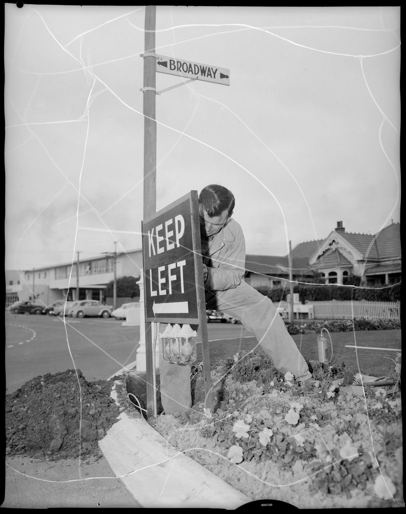 This image was taken for a story that ran in The Manawatu Evening Standard on 28 July 1961 "Red lights are being fitted below the "Keep Left" signs at the Broadway and Princess Street roundabout. Mr. K. Wynks, foreman cable jointer with the City Council, is seen attaching the lights to a sign in Broadway to make them more conspicuous to motorists."
