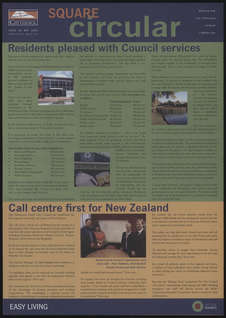 The Square Circular was Palmerston North City Council's monthly community publication, informing Palmerstonians of PNCC initiatives, activites, and events. This month's issue includes: Draft Annual Plan; customer survey results; council call centre; new head of civil defence; building regulations; youth council; civic award nominations; council representation; Milson Line road closure; Jazz and Blues festival; rodent control; Te Manawa; Keep Palmerston North Beautiful campaign.