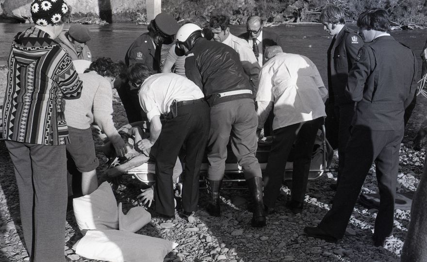 This series of images were taken for a story that ran in The Manawatu Evening Standard on 22 September, 1978. The article details a mid-river collision in the Manawatū Gorge during the Manawatū River stage of the 1978 CItizen Watch Jet Boat Marathon. The two boats that collided were Campbell Wilkie's "The Ugly" and Hilton McLachlan's "Ruffian" (with Ross Baker and Charles Hughes as crew). A third boat skippered by Bryan Harvey sustained damage whilst avoiding the collision. The photograph of P. Bayens' boat included in the article was not found with the negatives.