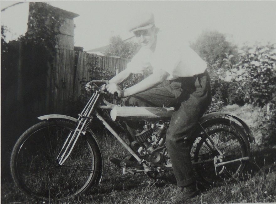 A photo of Fred Griffiths at home at 19 Ngata Street in circa 1926. The motorcycle he is straddling is a circa 1907-1909 Mountaineer, with a 275cc Moto Reve engine.