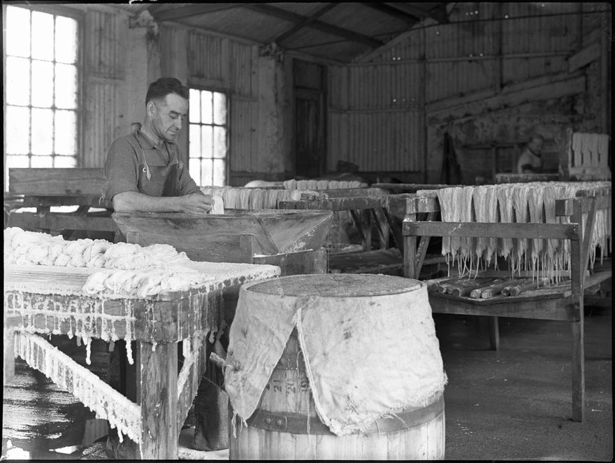 A worker procesing sheep intestines which were cleaned and stretched. The Kiwi Bacon Factory, adjacent to the Works, took most of the intestines for casing in the production of sausages. The Longburn Slaughtering and Freezing Company Ltd was established as a farmer's co-operative in 1890. Sited at Longburn, just south of Palmerston North, it later became known as the Longburn Freezing Works. It closed in 1986.