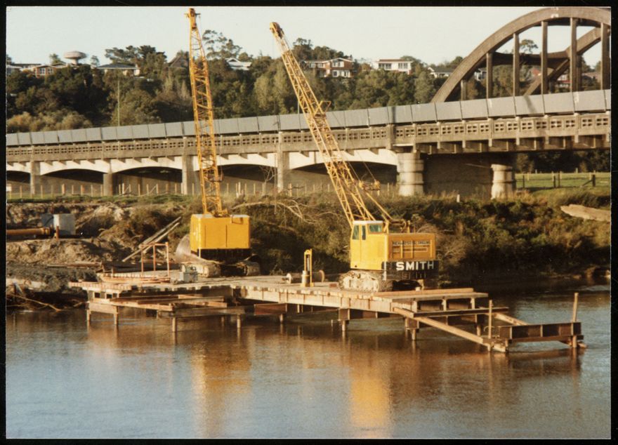 A bridge was first built across the Manawatū River in 1877, linking Palmerston North with the Fitzherbert area. The second bridge was constructed between 1933 - 1935 and remained in place until 1986 when it was replaced by the bridge being constructed in this series of photographs.