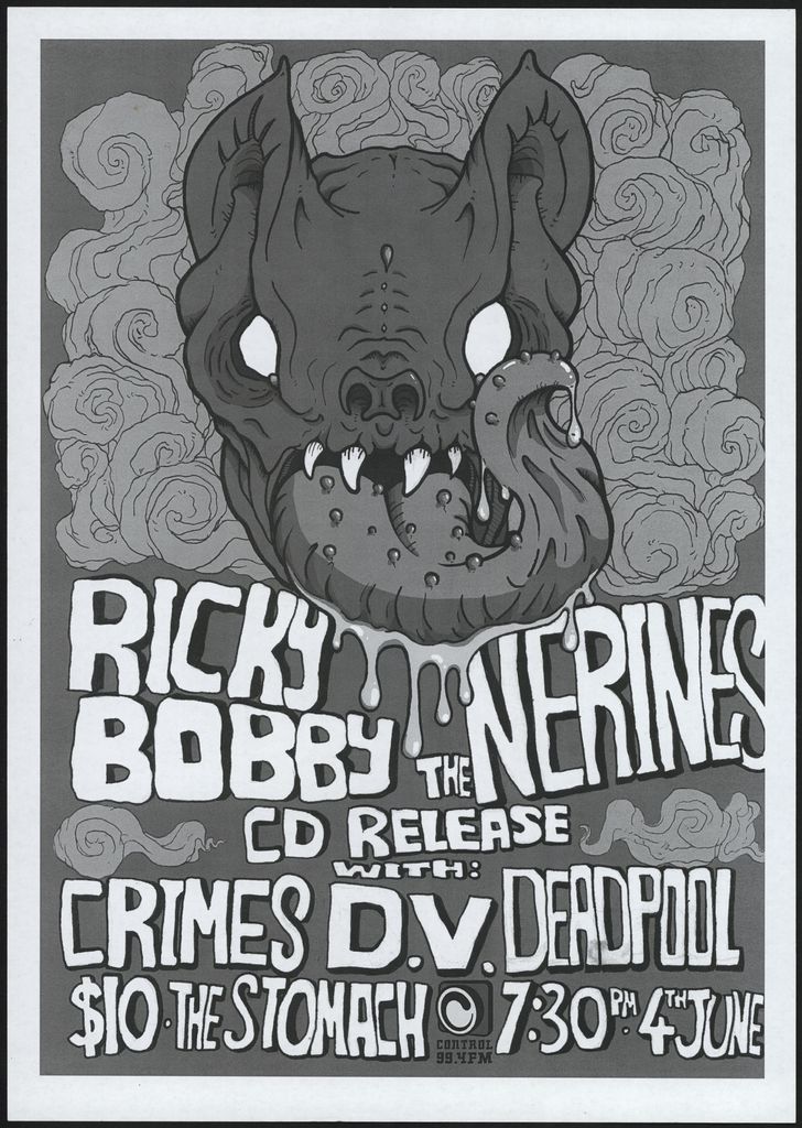 Ricky Bobby. The Nerines. The CD Release with Crimes, D.V., Deadpool. $10. The Stomach. 7:30pm 4th June. Part of a collection of posters that were displayed at The Stomach, Lombard Street, venue for Creative Sounds Society Incorporated.