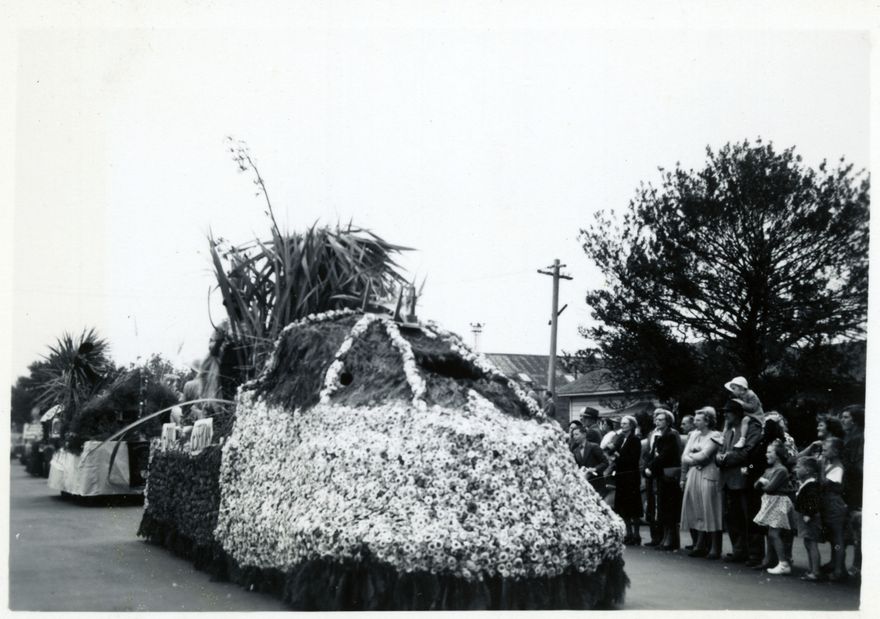 Palmerston North held its 75th Jubilee Celebrations during the week of 15th March 1952. Crowds watch as a float beautifully decorated with flowers as it takes part in the parade.