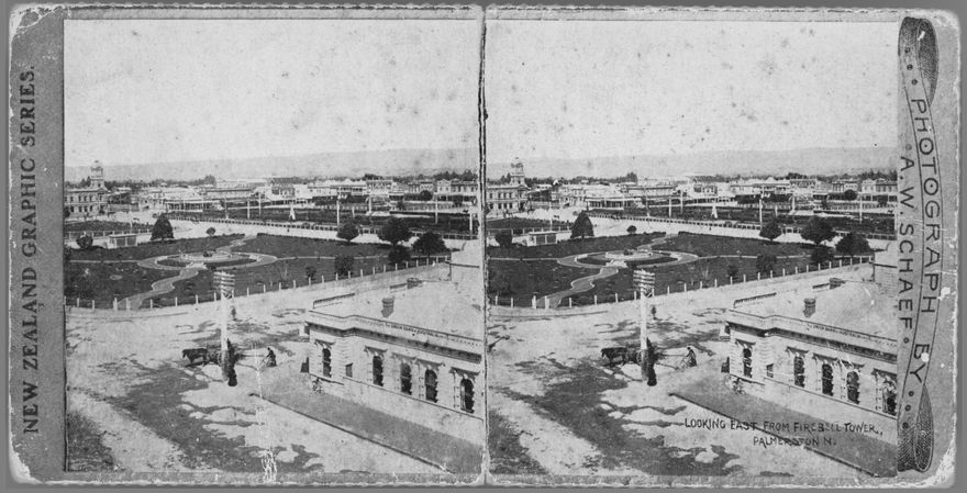 In the foreground is the Bank of Australia. This bank was constructed in 1910 – 1911 after a smaller wooden building on the site burnt down in 1910. It later became the “The Union Bank of Australia”, then the ANZ bank. In 1981 the ANZ moved and Coombe, Hughes and Company, Chartered accountants, converted the building to accommodate retail shops. The building is listed in category 4 of the New Zealand Historic Places Trust register, due to its architectural significance. In the middle of the picture is the fountain in the western quadrant of The Square- this photograph shows it before the Coronation monument for Edward VII was added on top (1925). The building to the left with a clock tower is the Post Office. Built in 1906, on the corner of The Square and Main Street was Palmerston North’s fourth. Due to the risks in an earthquake, the clock tower was removed in 1942. They were re-purposed for the Hopwood Clock Tower. In 1988, when Telecom and Postbank became separate entities, the building ceased to be the Post Office. It currently operates as a restaurant and bar.