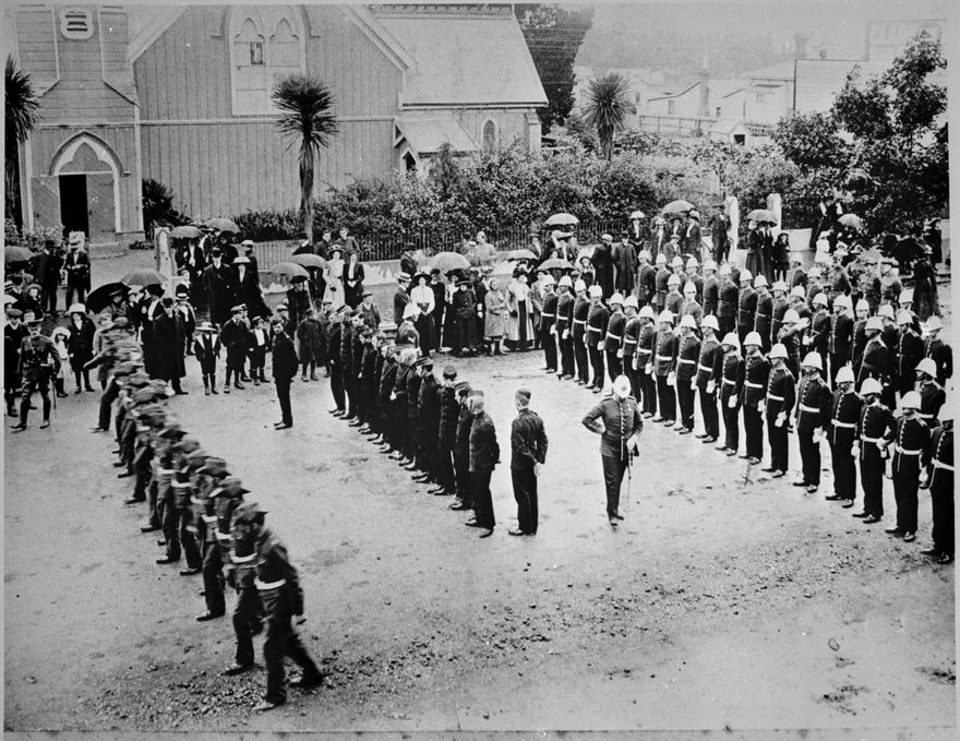 The Manawatu Mounted Rifles outside the All Saints Anglican Church in Church Street. The first rank is under Captain Peach (possibly Dr Peach an early medical practitioner in Palmerston North). Second rank is possibly the cadet corps. The third rank is the Palmerston North Rifles under Captain Mounsey ( auctioneer and founder of Mounsey & Co.). The fourth rank is Palmerston North Guards under Captain McMurray. The fifth rank is unknown. E S Baker is pictured in the middle of the fourth rank.