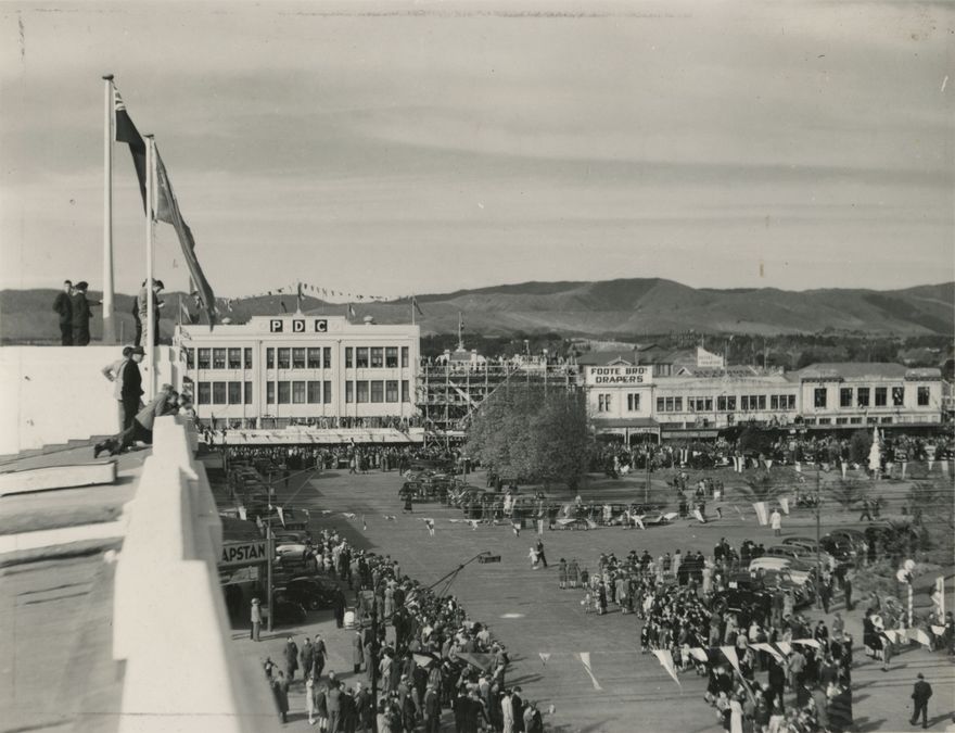 Peace with Germany was announced 8 May 1945 and official celebrations took place in Palmerston North the following day. Church services were held at 10am, followed by general celebrations. The procession marched round The Square to the Band Rotunda.