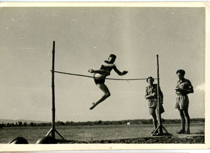"Soak" Grammer doing the high jump at the 6th forward division regiment sports day.
