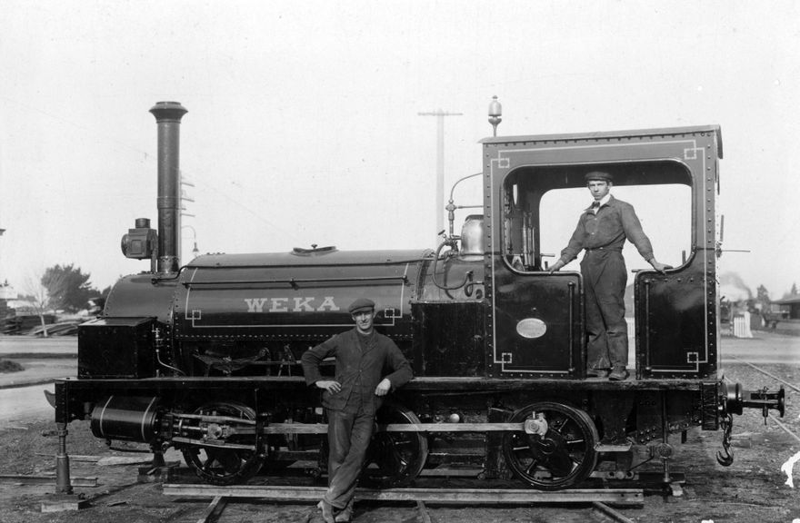 The person standing in front of the engine is my Father Harold Stewart and the person on the footplate is his brother David Stewart. Both men were trained at the workshops. They were sons of J T Stewart the person who surveyed the Manawatu/Rangitikei districts and laid out Palmerston North and other settlements. The Weka was refurbished at the Feilding workshop of Harold Stewart located in Beaty St. This photograph was taken in the northern goods yard of the Feilding railway station. A north-bound train can be seen leaving the station about to cross Kimbolton Rd. Photograph taken 1906.