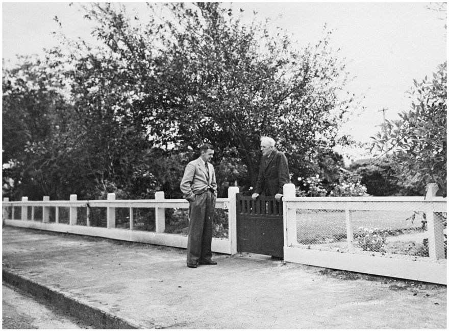 A photographic series prepared by the Prime Minister’s Department in 1947 to attract British migrants. The Evans family of 5 Mansford Place, Palmerston North were selected to show the living conditions of a typical New Zealand family. Jack Evans chats with Palmerston North Mayor, Augustus (Gus) Mansford, at the gate of his house in Chaytor Street. Betty Evans was a member of the Business Girls’ Club of which the Mayoress was patron and Mrs Mansford arranged for the Evans family to be chosen for the publicity photographs. Before her marriage Betty was a tailoress, working at the firm of Crawford and Neil in The Square. The photograph may also be intended to show the lack of class distinctions in New Zealand.