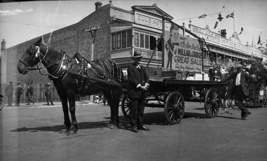 The wagon display is for Millar and Giorgi, menswear shop (established 1902), and is halted outside the Club Hotel in Church Street. David (Davey) Lloyd, standing by horse, was the last of Palmerston North’s horse-drawn carters, operating until the 1950s.