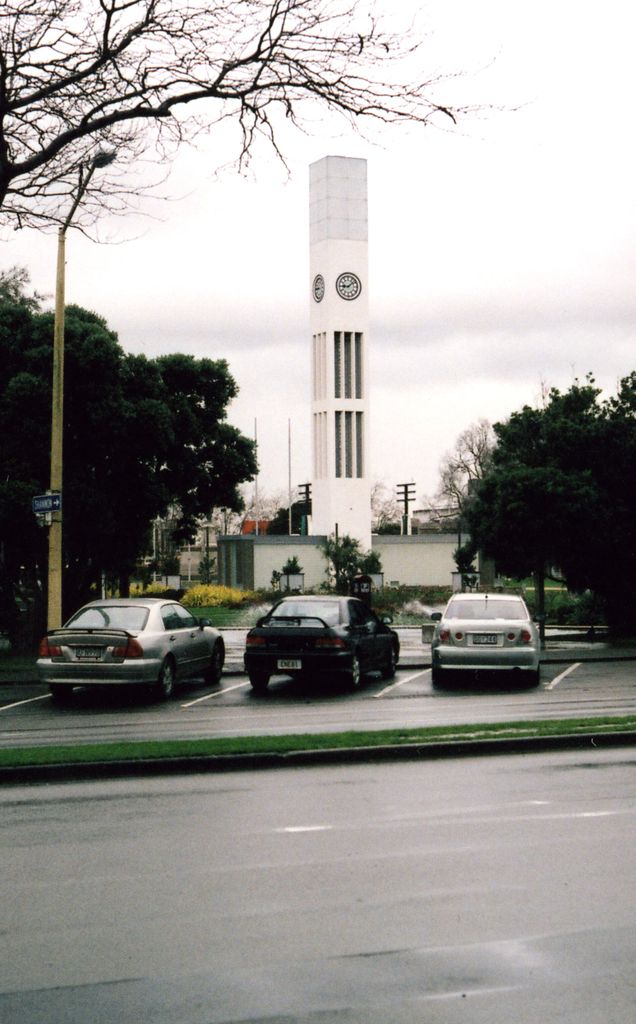 The clock tower was constructed with money donated by Arthur Hopwood, a local businessman in 1955. The sound shell as seen in this image was removed in the 1990s and the tower extended by the additions of a 'lantern' at the top in the 2000s.