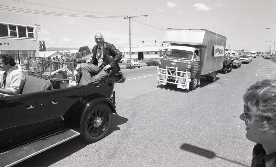 National candidate for Palmerston North John Lithgow shares the cab of a vintage vehicle with his wife Ann as part of Prime Minister Muldoon’s election campaign Road Show. Three vehicles containing the Lithgow’s, National candidate for Manawatu Michael Cox with his wife Jenny, and the Prime Minister Rob Muldoon with his wife Thea set up along Church Street near the corner of McGiffert, opposite the railway land. Nearby businesses Kidd Garrett Ltd and Haulage Parts Ltd can be seen in the background. Once underway the touring party endured moderate heckling and protest placards, including one reading “Hope lies dying in a Muldoom tomb”.