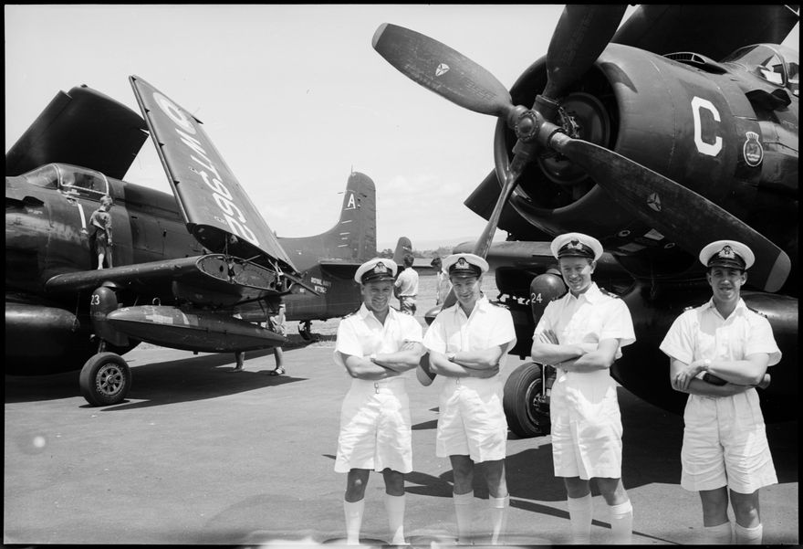 This image was taken for a story that ran in The Manawatu Evening Standard on 27 January, 1959. "On Saturday morning, while a "Manawatu Standard" representative was on the Tauranga aerodrome, these two aircraft, from H.M.S. Albion, the British aircraft-carrier visiting New Zealand from the Far East station, flew in on a brief visit to give flying displays. They are Douglas Skyraiders. From left: Lieutenants G. A. Harris, D. A. Atkinson, G. A. Hill and H. N. [unreadable)."