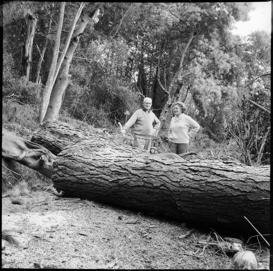 This image was taken for a story that ran in the Manawatu Evening Standard on 16 July, 1963. "Ministry of Works men (top picture) are seen clearing away this tree which fell half-way across the Palmerston North-Shannon highway opposite Massey College in yesterday's strong winds. Mr and Mrs G. A. Eliott, who live opposite Massey College, and who found themselves stranded on their property when this large pine tree, 4ft in diameter, fell across their driveway late yesterday afternoon, soon after their arrival home, stand beside the trunk in the lower photograph."