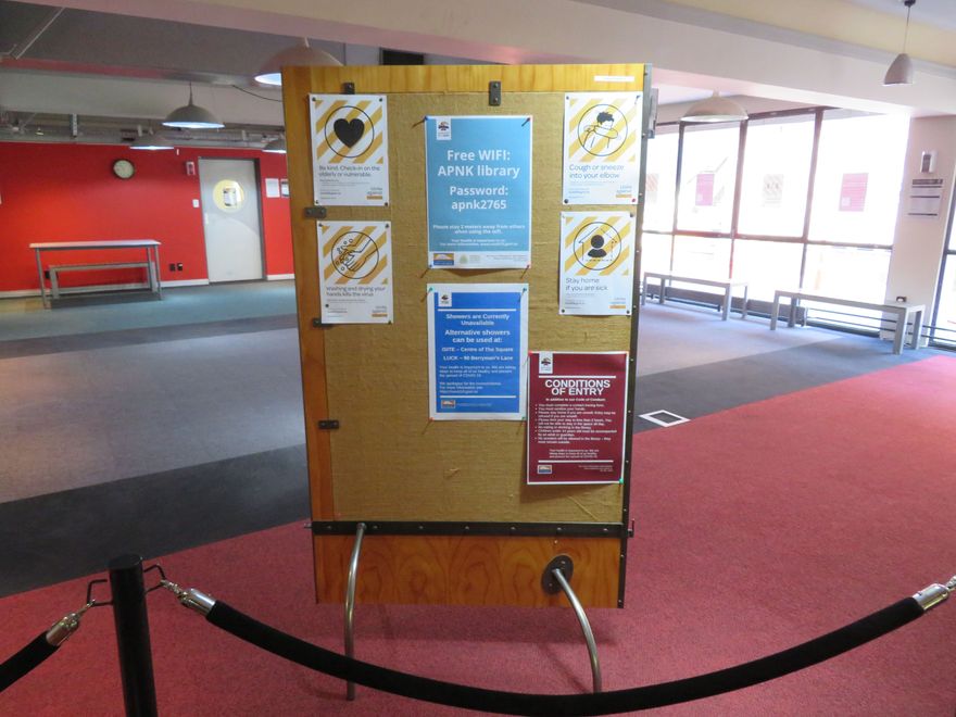 A message board at the entrance of Palmerston North City Library notifying patrons of some of the changes in place due to the COVID-19 pandemic.