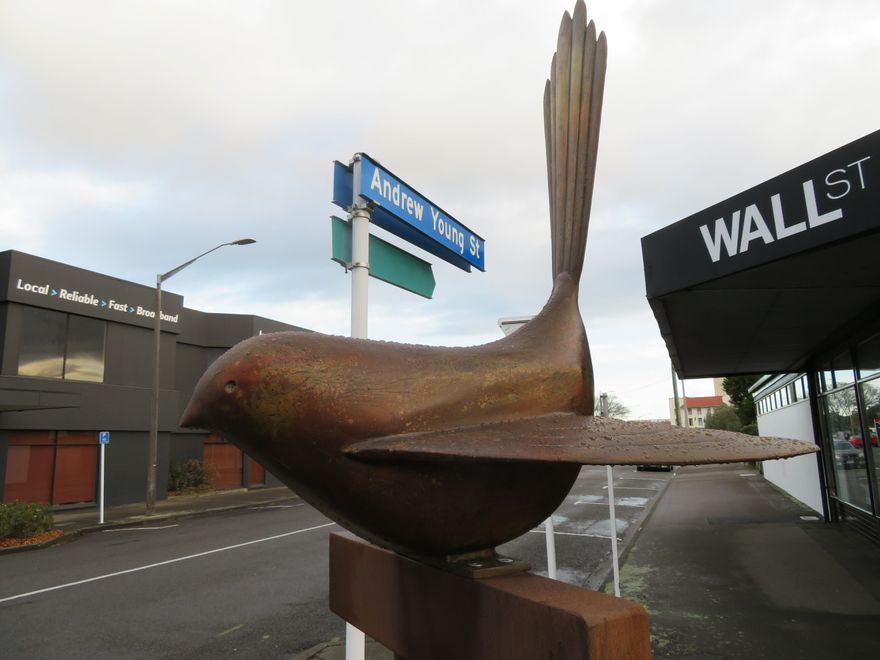 This bronze pīwakawaka is the work of sculptor Paul Dibble. The work, titled Gateway, features a large fantail, perched on a Corten steel base, and references Maui myths, with the pīwakawaka perched on a stylised leafy gate.